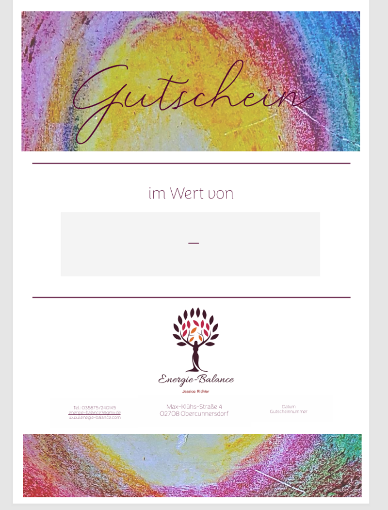 Ihren Gutschein sende ich Ihnen gern per Mail oder Post. Kontaktieren Sie mich dazu einfach per Telefon oder E-Mail und teilen Sie mir Layout und Gutscheinwert mit.